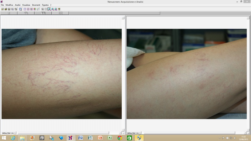 Teleangiectasie del volto. Tutti i laser attualmente utilizzati per il tessuto vascolare sono in grado di trattare tali affezioni. Le teleangectasie del volto, a differenza di quelle degli arti inferiori sono più superficiali e tutte localizzate alla stessa profondità. Per questo risulta piuttosto agevole trattare tali vasi in maniera uniforme ed omogenea se si utilizzano lunghezze d’onda e durata degli impulsi adeguate (fig. 1).