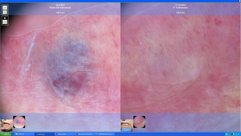 tendono ad approfondirsi con la comparsa di noduli e placche di colorito violaceo. Il trattamento di scelta è rappresentato dal laser Dye 585nm che grazie alla sua grande specificità per il tessuto