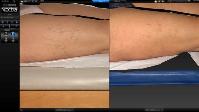 Teleangiectasie degli arti inferiori.Il trattamento laser dei vasi degli arti inferiori non è così efficace come per i vasi del volto. Tale differenza è dovuta a diversi fattori quali l’aumento della pressione idrostatica e la profondità dei vasi degli arti. Questi elementi rendono il potere distruttivo dei laser meno significativo. Il problema del trattamento dei vasi arteriosi e venosi degli arti inferiori è anche legato alle diverse profondità a cui tali teleangiectasie sono situate. Tuttavia, i risultati ottenuti utilizzando dei laser appropriati sono spesso soddisfacenti (fig. 2).